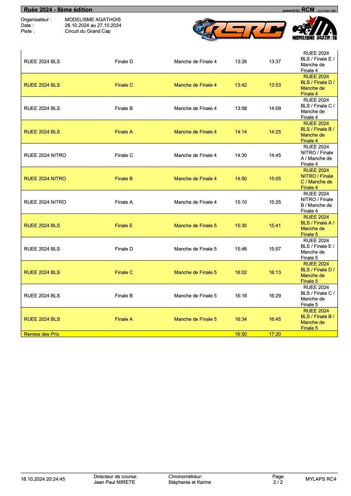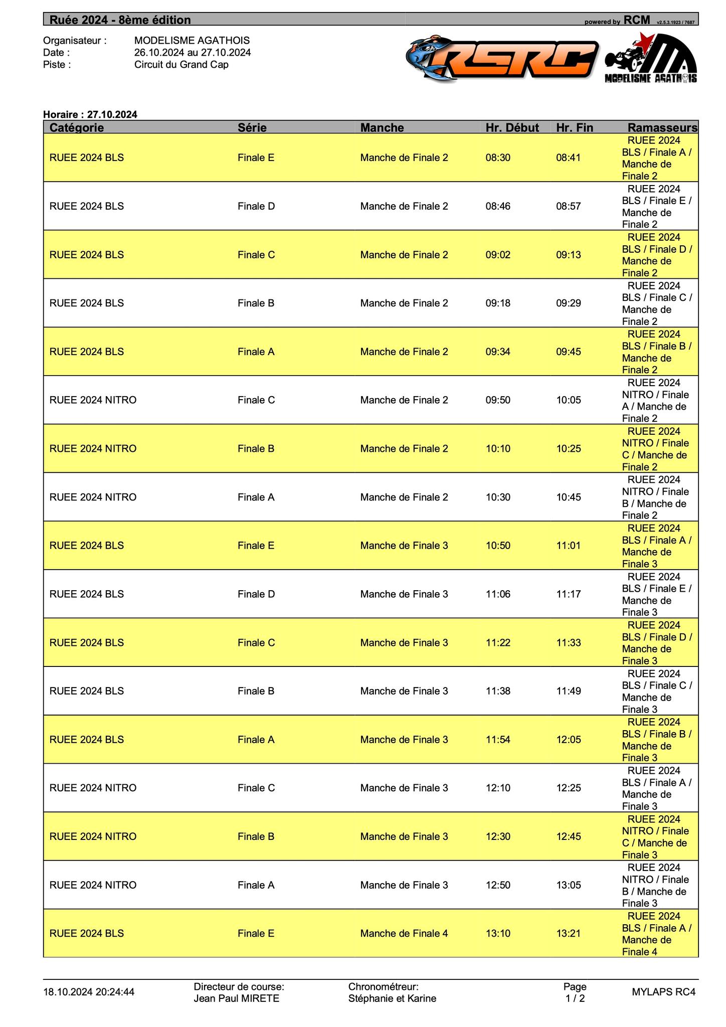 Dimanche : les finales de sont ramenées de 5 à 4 en brushless et de 4 à 3 en Nitro à cause des intempéries du samedi.