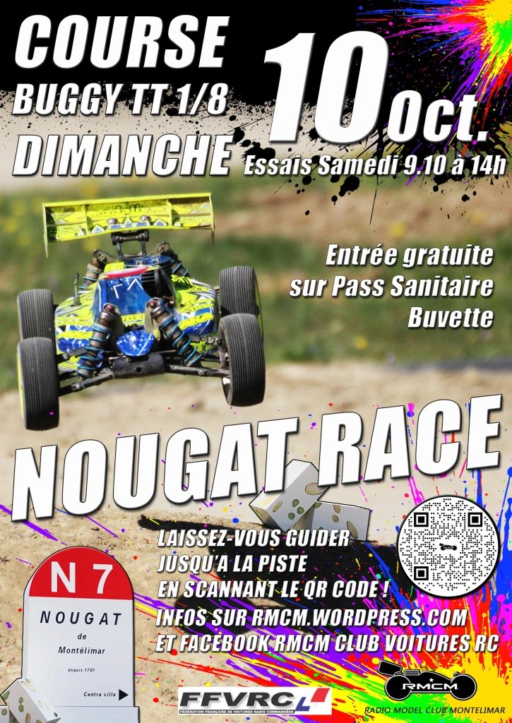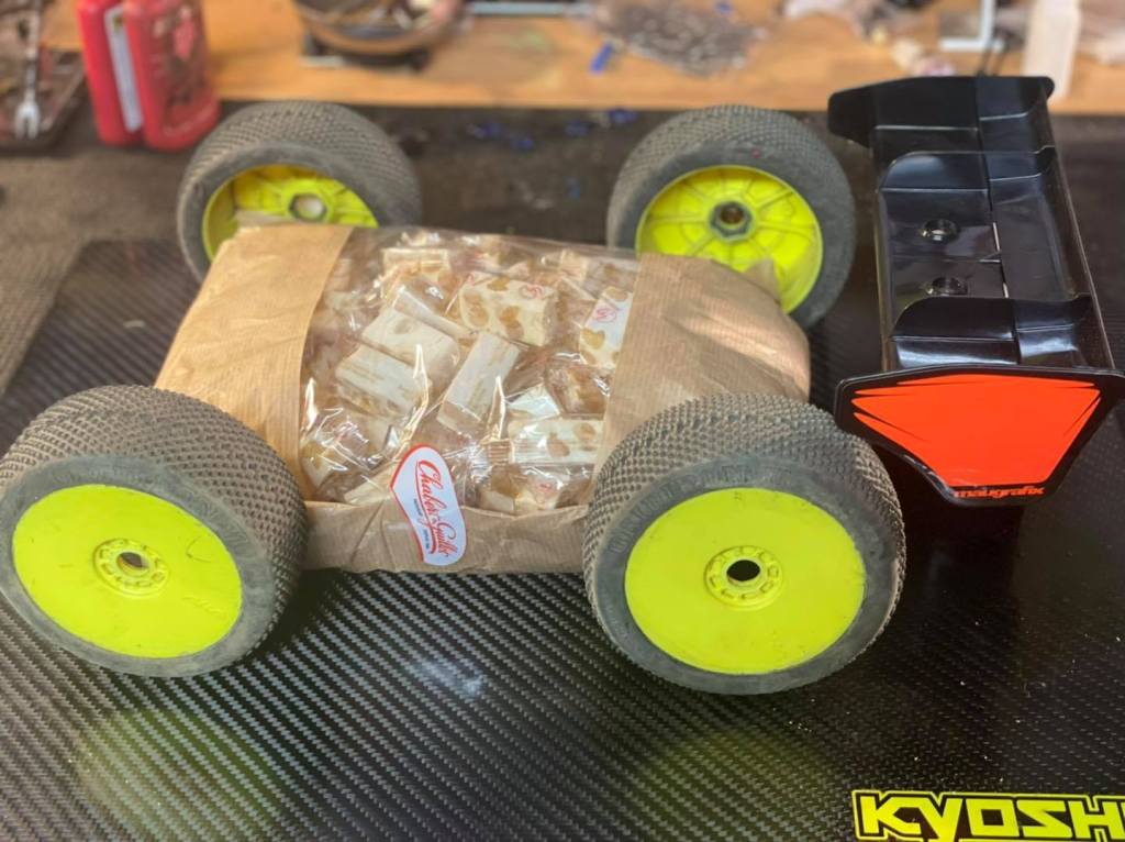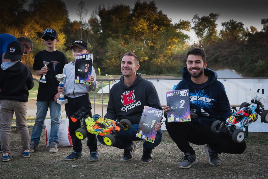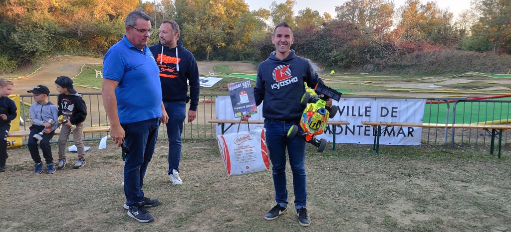 A noter que pour finir sur une note aussi fun que sportive, nous avons organisé la Finale du Super Nougat. Le principe est simple : les deux meilleurs en Brushless doivent affronter les deux meilleurs en Nitro, sur un nombre de tours tiré au hasard, sans aucun ramasseur, sur fond de musique techno endiablée ! C’est au très jeune et déjà très doué Damon Da Silva que revint l’honneur de jeter le dé qui s’arrêta sur sa cinquième face ! Après 5 tours très intenses les places se figèrent : 4 Arthur Hernandez (bls), 3 Patrick Auvinet Jr(Nitro), 2 Gaétan Anger (bls), et 1 Reno Savoya (Nitro) qui repartit avec le poids de sa voiture en Nougat offert par la Maison Chabert et Guillot !!!